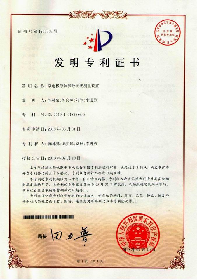 本發(fā)明的目的是提供一個雙電極液體多參數(shù)在線測量裝置,結(jié)構(gòu)簡單,工作可靠和使用方便,能同時(shí)檢測多個液體的相關(guān)參數(shù),自動清洗電極表面,提高檢測精度。我司著重加大對科研的投入力度,積極開展技術(shù)創(chuàng)新工作,通過多年來的努力,公司獲得國家專利授權(quán)多項(xiàng),其中發(fā)明專利2項(xiàng),實(shí)用新型專利4項(xiàng),在審的發(fā)明專利3項(xiàng)。